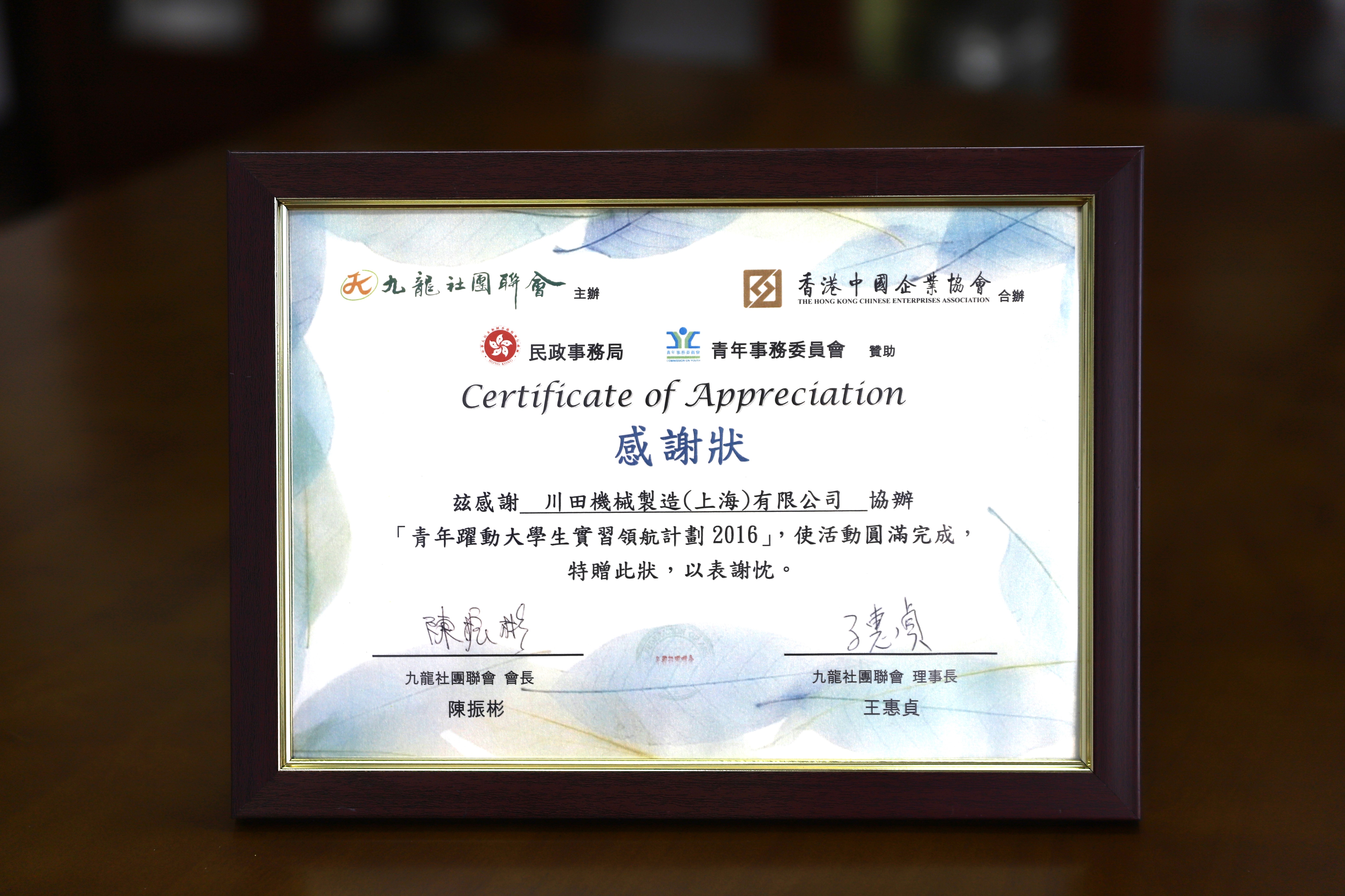 2016 青年悅動大學(xué)生實(shí)習(xí)領(lǐng)航計(jì)劃感謝狀