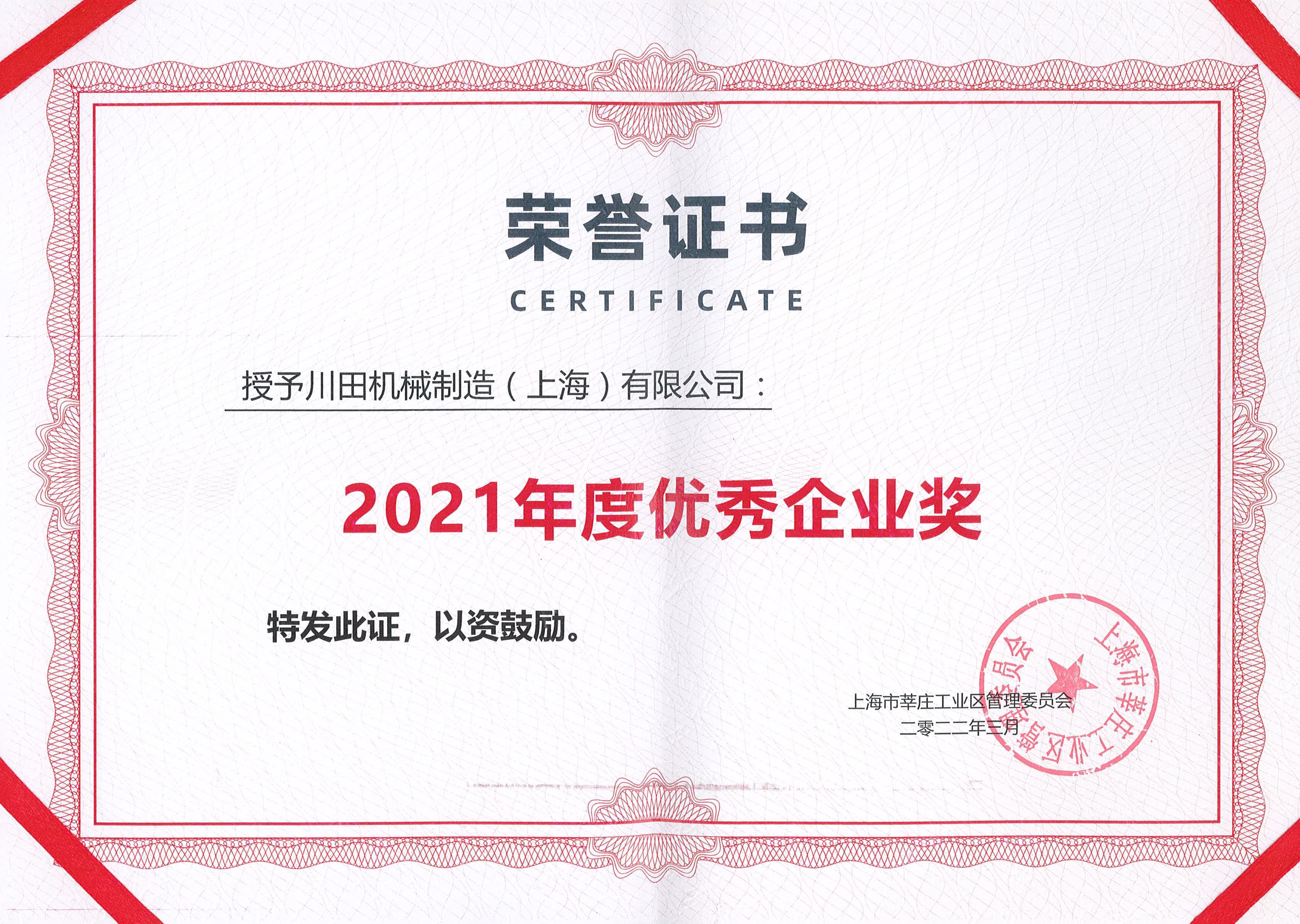 2021年度莘莊工業(yè)區(qū)優(yōu)秀企業(yè)証書
