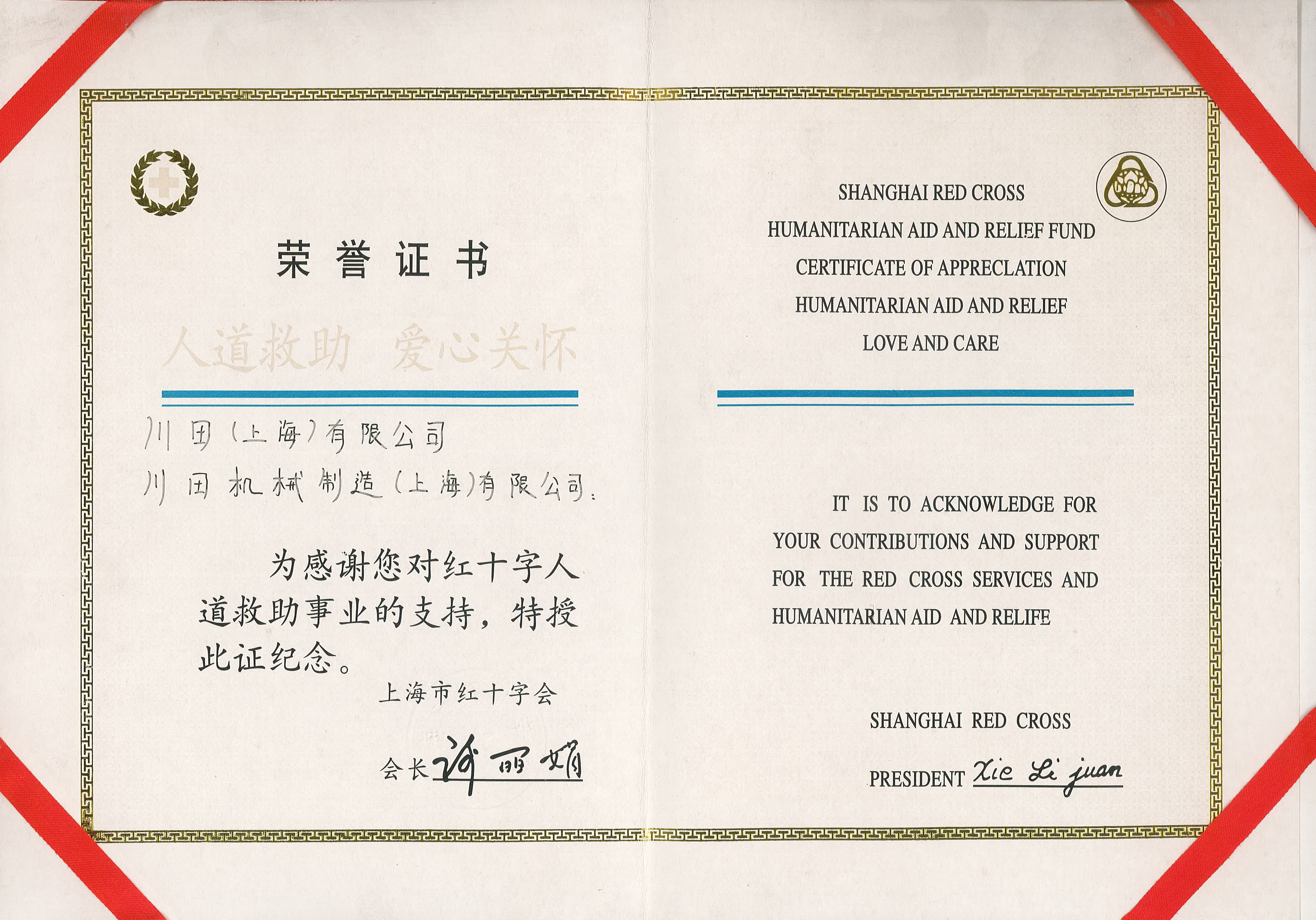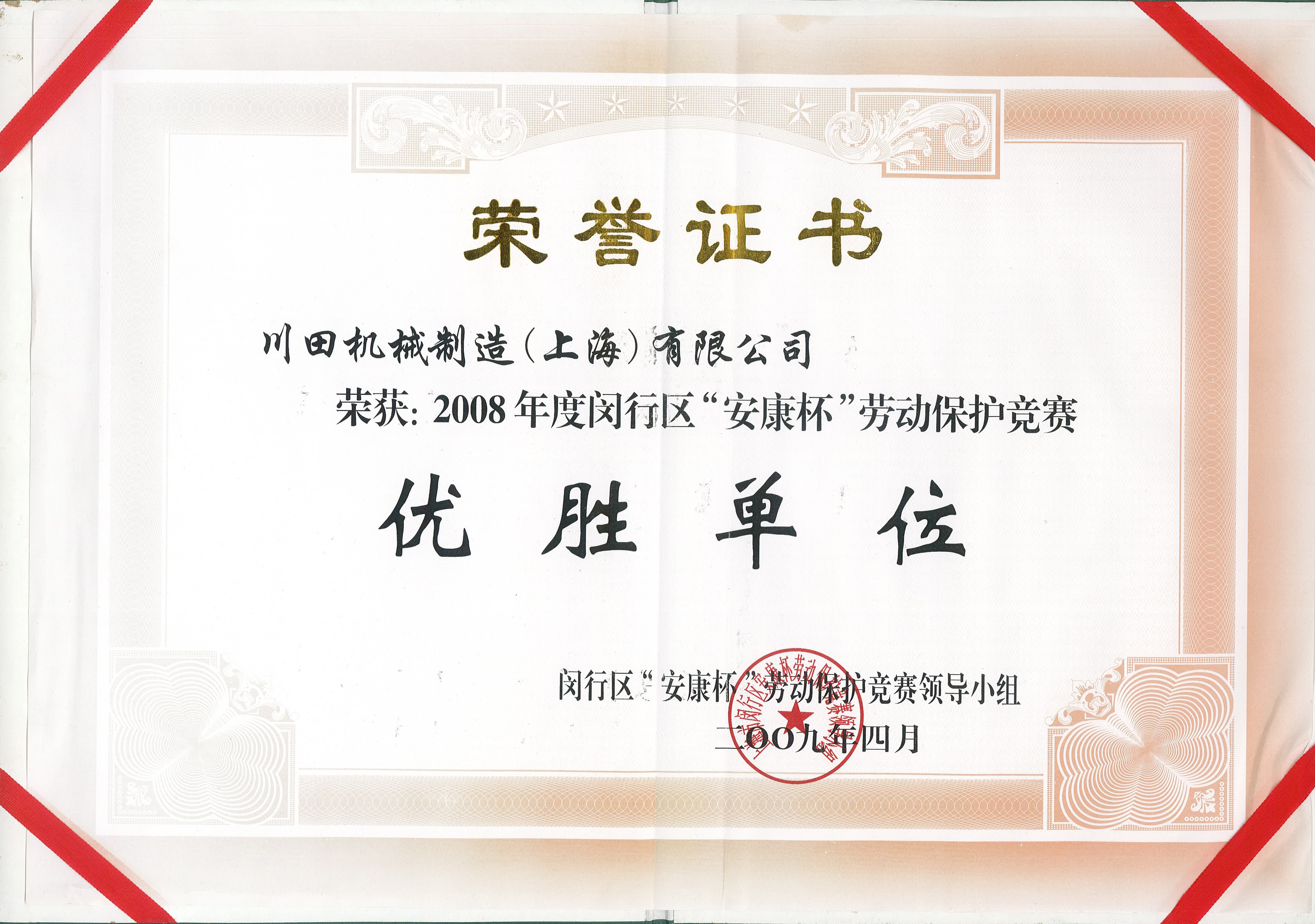 2008年度上海市赤十字栄譽(yù)証書-川田株式會(huì)社